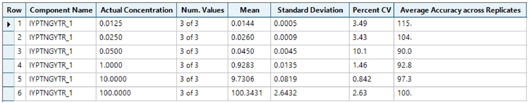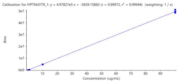 Linearity was achieved across concentrations ranging from 0.0125 µg/mL to 100 µg/mL (Figure 3), achieving an LDR of 3.9 orders of magnitude. A coefficient of determination (r2) of >0.999 was reached, with a weighting factor of 1/x.