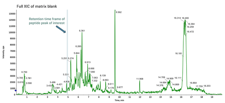 Several optimizations were performed for chromatographic separation to help separate the background from the peptide of interest. The tryptic digest of trastuzumab emtansine produced a complex peptide profile with numerous coeluting peaks, complicating quantitation. Figure 2 shows the full XIC of the human serum matrix blank and highlights the retention time frame of the peptide peak of interest, IYPTNGYTR, along with several close eluting matrix components. To achieve baseline separation of these matrix components and the peptide of interest, IYPTNGYTRb, a longer gradient was applied.
