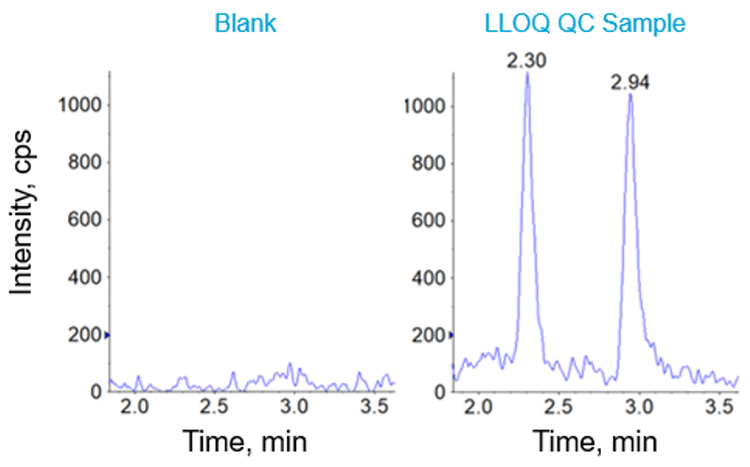 Selectivity, specificity and carryover: Eight different lots of blank plasma were extracted and analyzed using the developed LC-MS/MS method along with the corresponding lots of plasma spiked at the lower limit of quantitation (LLOQ) and working internal standard concentration. Carry over was evaluated by injecting the following sample set: extracted blank, LLOQ, ULOQ and extracted blank. Percentage interference at the retention time of the analyte was monitored and calculated against the LLOQ area response and internal standard area response. Analytes and Internal standard showed high degree of selectivity and specificity in the proposed method. Blank samples injected after ULOQ samples did not show quantifiable response, demonstrating that the proposed method has no carry over. Chromatograms of extracted plasma blank, plasma spiked LLOQ are displayed in Figure 2. A summary of carry over data is presented in Table 1.