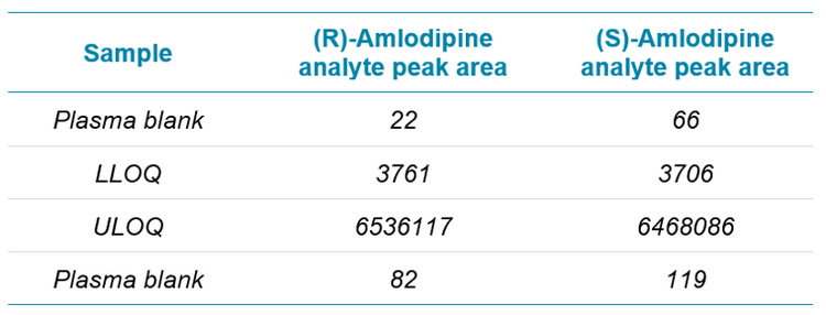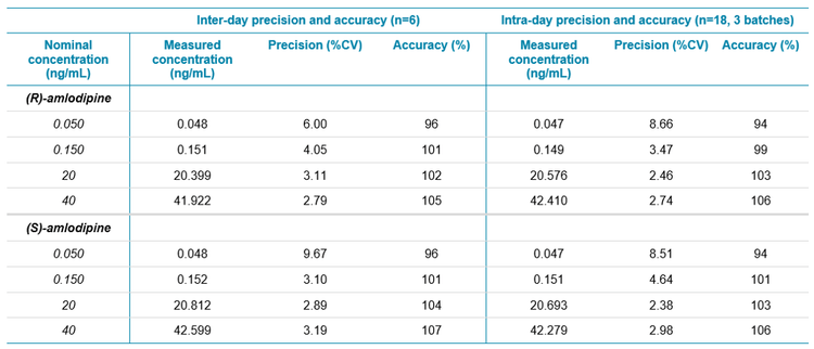 Dilution integrity: The upper level of quantitation for (R)-Amlodipine and (S)-Amlodipine is 50 ng/mL. A dilution integrity test was performed by spiking 1.6x concentrations of ULOQ in plasma samples and diluted 4-fold and 2-fold with blank plasma. The average percentage recoveries for 4-fold and 2-fold dilutions for 6 replicate injections each were 94.90% for (R)-Amlodipine and 96.40% for (S)-Amlodipine.