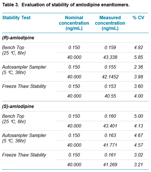 Stability: Stability studies in human plasma were evaluated to cover a wide range of expected experimental and storage conditions. Analytes and Internal standard were found to be stable at benchtop for 6 hours, in autosampler for 48 hours and for 3 freeze thaw cycles of stability studies. Sample stock solutions were also found stable in refrigerator conditions (2°C to 8°C) for 4 days. A summary of stability data is listed in Table 3.