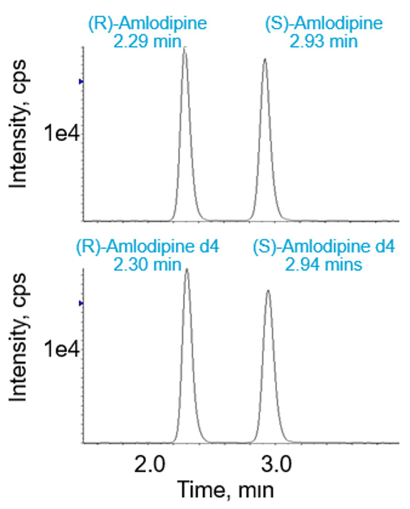 A method for the analysis of the R and S enantiomers of Amlodipine using a SCIEX QTRAP® 4500 system, an ExionLC™ System and a Phenomenex Lux HPLC column, in human plasma with an LLOQ of 0.050 ng/ml is described.
