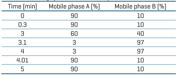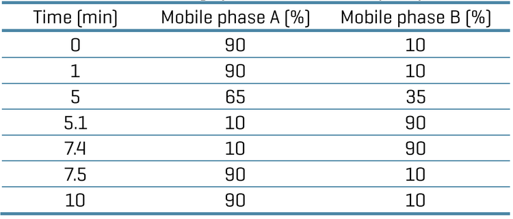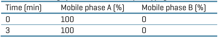 Analytical flow LC conditions: The UHPLC separation was performed using an ExionLC AE system (SCIEX) . The chromatography column used was a Phenomenex bioZen Peptide XB-C18 (50 x 2.1 mm, 2.6 μm), and the column oven temperature was 40°C. The gradient conditions are in Table 1. The injected sample volume was 2 μL. The mobile phase A consisted of 0.1% (v/v) formic acid in water, and the mobile phase B was composed of 0.1% (v/v) formic acid in acetonitrile. The flow rate was set to 0.3 mL/min.