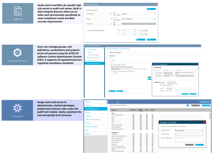 Figure 6 illustrates the features of SCIEX OS software used to monitor the audit trail, acquire and process data, and configure user access. The audit trail feature enables users to audit critical user actions and locks in data integrity. The Central Administrator Console (CAC) feature allows users to centralize acquisition and processing on a single platform, maximizing efficiency for multi-instrument laboratories, regardless of compliance standards. The configuration module allows users to assign roles an d access as the administrator, method developer, analyst, and reviewer.