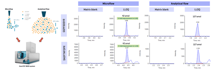 - Enhanced sensitivity using microflow: Demonstration of improved LLOQs across 6 peptides (at low- attomole level) in extracted rat plasma using microflow on the ZenoTOF 8600 system.