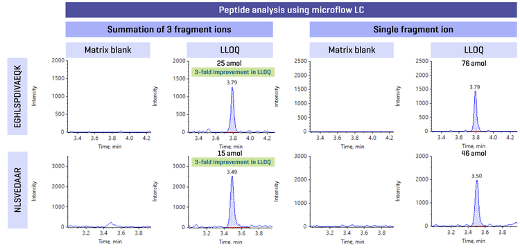 Figure 2 shows a microflow-based result for the summation of highly abundant fragment ions, thereby improving the signal-to-noise ratio (S/N) and increasing assay sensitivity. Peptides EGHLSPDIVAEQK and NLSVEDAAR show a 3-fold improvement in LLOQ with summation of 3 fragment ions when compared to quantitation using a single fragment ion.
