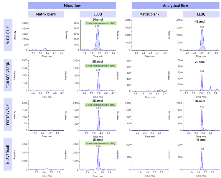 Representative peptide XICs were displayed to highlight the improvement in LLOQ achieved with microflow LC compared with analytical flow LC (Figure 3). Peptides SADFTNFDPR , EGHLSPDIVAEQK, ESDTSYVSLK , and NLSVEDAAR showed a 3-fold improvement in LLOQ compared with analytical flow LC. The observed gain in sensitivity was primarily attributed to improved ionization efficiency at a microflow rate.