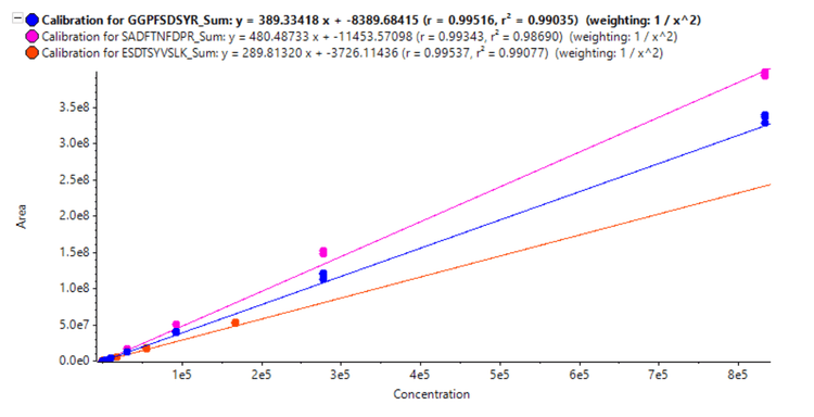 Calibration curves from analysis of 3 representative peptides are shown in Figure 4. Overall, an LDR of up to 4.3 orders of magnitude was achieved for peptide analysis using microflow LC, demonstrating measurement of a wide range of concentrations.