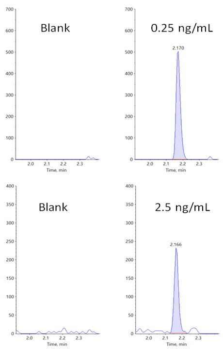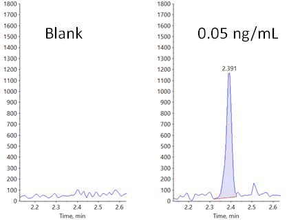 MRMHR methods, which closely parallel triple quadrupole MRM methods, will generally be the most sensitive approaches for routine quantification. But a distinct advantage of quadrupole time-of-flight (TOF) systems is the flexibility to generate good quantitative data using different types of methods. Here, quantitative data will be shown for 2 model small molecule compounds in protein-precipitated rat plasma (Figure 1). Generic sample prep and chromatography is used to mimic the routine nature of an early-stage discovery bioanalytical laboratory, where scientists may not always have time to optimize conditions for each new molecule that requires analysis. In addition to MRMHR, sensitivity and linearity are shown and discussed for alternative mass spectrometry methods—including TOF MS, Zeno SIM, Zeno MRMHR and Zeno EAD MRMHR—to show how the flexibility of the platform can be used to approach quantification when different workflow needs arise.