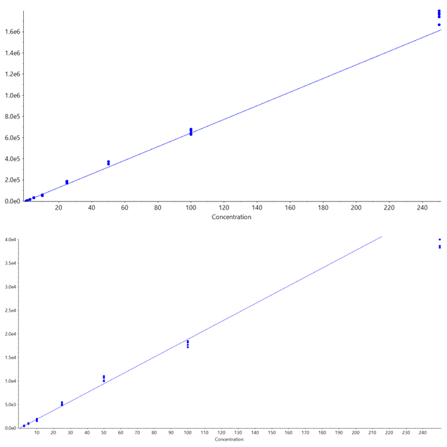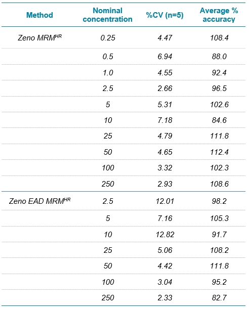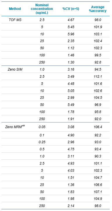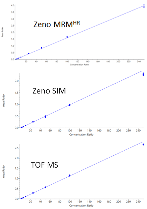 Calibration curves were linear over the range tested (0.05 ng/mL to 250 ng/mL) and are shown in Figure 3. Calibration curve data are summarized in Table 4. It should be noted that the TOF MS experiment is present in both the Zeno SIM method and the Zeno MRMHR method. The data were evaluated for each case and, as expected, were virtually identical in both cases (duplicate data not shown).