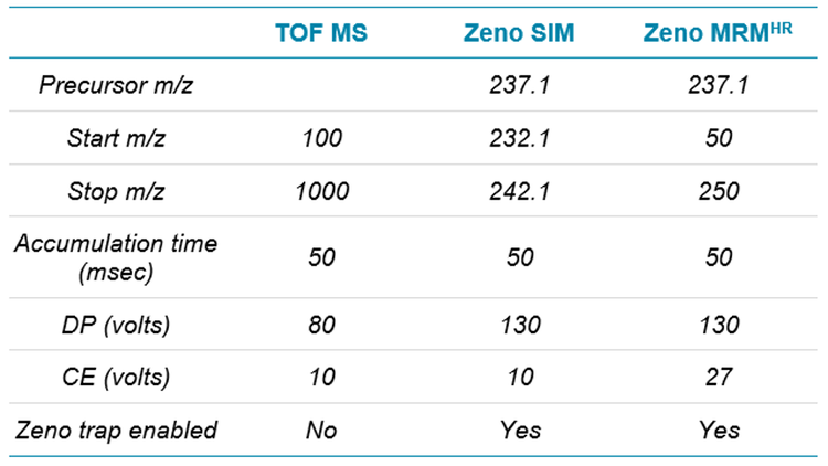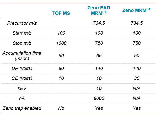 Mass spectrometry:For this study, 4 methods—TOF MS, Zeno SIM, Zeno MRMHR and Zeno EAD MRMHR—were used on the ZenoTOF 7600 system, the details of which are shared along with a discussion of the data generated for each. To make data comparisons between them as relevant as possible, they will be discussed in 2 groups: TOF MS is compared with Zeno SIM and with Zeno MRMHR, and then Zeno MRMHR is compared with Zeno EAD MRMHR. The source settings, listed in Table 2, were common to all methods.