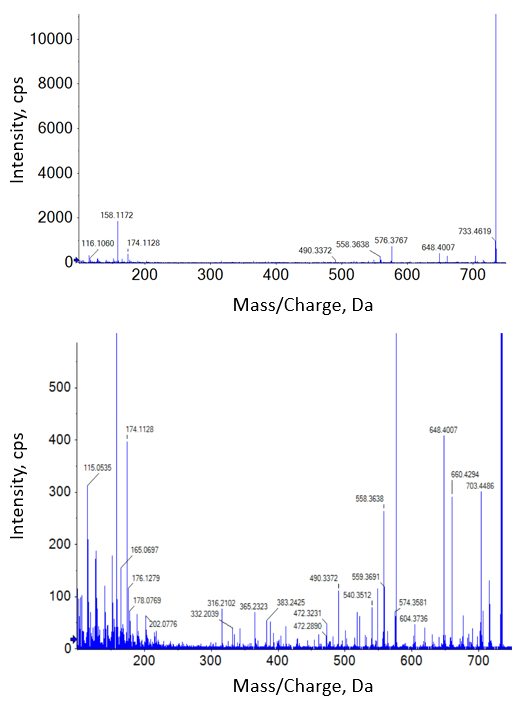It’s useful to understand the differences in spectra produced by CID and EAD when considering fragment-based quantification. Figure 4 and Figure 5 show MS/MS spectra from the 100 ng/mL standards for erythromycin from each method. The CID spectra show a typical small molecule fragmentation pattern, with some precursor remaining and a few well-defined fragments that would be good candidates for use in quantification (Figure 4). A closer look at the spectra at the noise level shows 37 total fragments significantly above noise level.