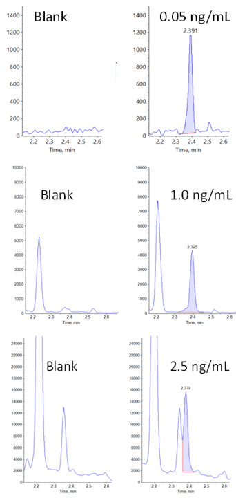 As would be expected for a typical small molecule analyte, the Zeno MRMHR method showed the highest level of sensitivity, with good signal to noise and reproducibility at the lowest prepared calibration point (Figure 2 and Table 4). The Zeno SIM analysis showed a small improvement over the TOF MS analysis, along with an unexpected improvement in specificity due to the significant reduction of an isobaric peak that is not completely baseline resolved from the analyte of interest in the TOF MS method. It is possible this represents a labile, higher molecular weight species that fragments to the parent m/z of the analyte of interest in Q2 even at the low collision energy, but is filtered out by the narrow m/z selection of Q1 in the Zeno SIM method. Regardless, this represents a real-world problem that can be encountered in fast-paced environments that allow for little to no method optimization. As previously mentioned, the Zeno SIM method is a no-tune, no-optimization method that can provide improved assay quality over a typical no-tune accurate mass method.