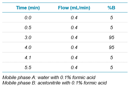 Chromatography: A generic, non-optimized short HPLC gradient was used for analysis, which was run on a SCIEX ExionLC AD system with a Phenomenex Kinetex C18, 2.6 µm particle, 50 x 3 mm column (P/N 00B-4462-Y0). A 5 µL injection volume was used, and the LC gradient is shown in Table 1.
