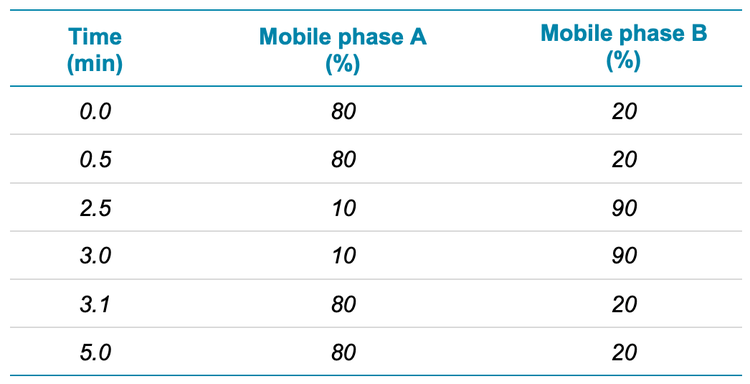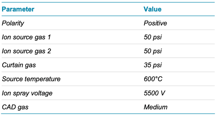 Chromatography: Sample separation was performed using an ExionLC AD system at a flow rate of 0.3 mL/min on an Acquity UPLC BEH C18 column (2.1 x 50 mm, 1.7 µm, 130 Å). A 5- minute gradient was run using 0.1% formic acid in water as mobile phase A and 0.1% formic acid in acetonitrile as mobile phase B (Table 1). The column temperature was maintained at 40°C. An injection volume of 10 μL was used for analysis.