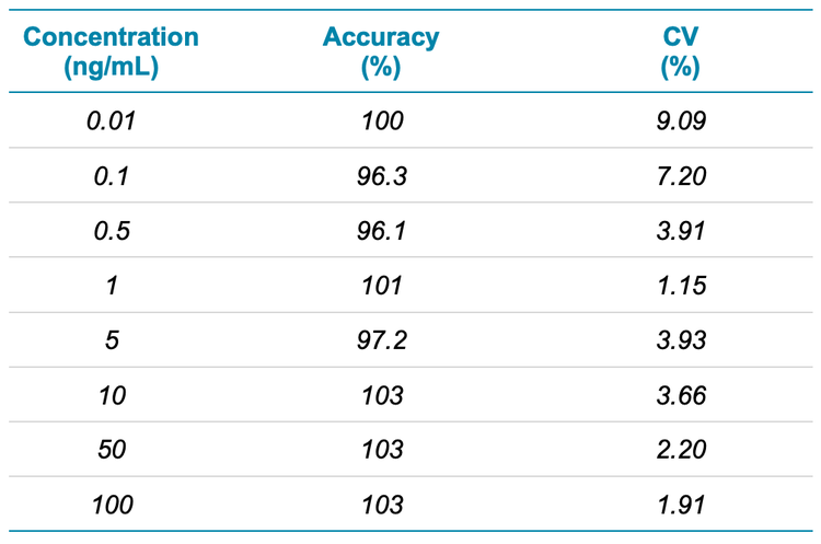 Analytical performance was evaluated for accuracy and precision. The accuracy of the calculated mean was expected to be between 80% and 120% at the LLOQ and between 85% and 115% at higher concentrations. The %CV of the calculated mean for each concentration was expected to be <20% at the LLOQ and <15% at higher concentrations.