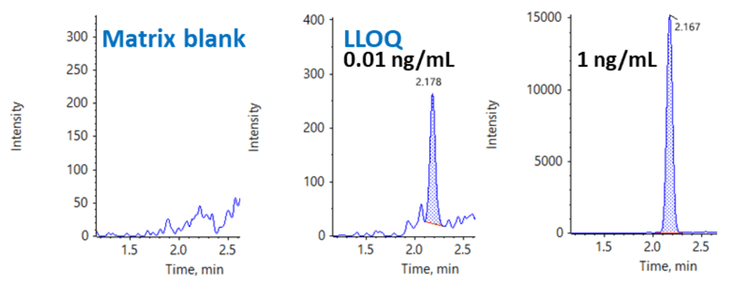 Carryover was evaluated by injecting a blank sample before and after the upper limit of quantitation (ULOQ) at 100 pg/mL. Figure 3 shows that no carryover was observed in the XICs run before and after the ULOQ.