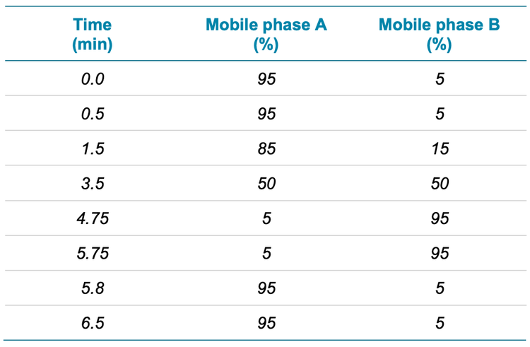 Chromatography: Separation was performed on a Phenomenex Luna Omega Polar C18 (2.1 x 150 mm, 3 µm, 100 Å) column at 40°C. Mobile phase A was 0.1% (v/v) formic acid in water and mobile phase B was 0.1% (v/v) formic acid in acetonitrile. An injection of 5 µL was used for analysis.
