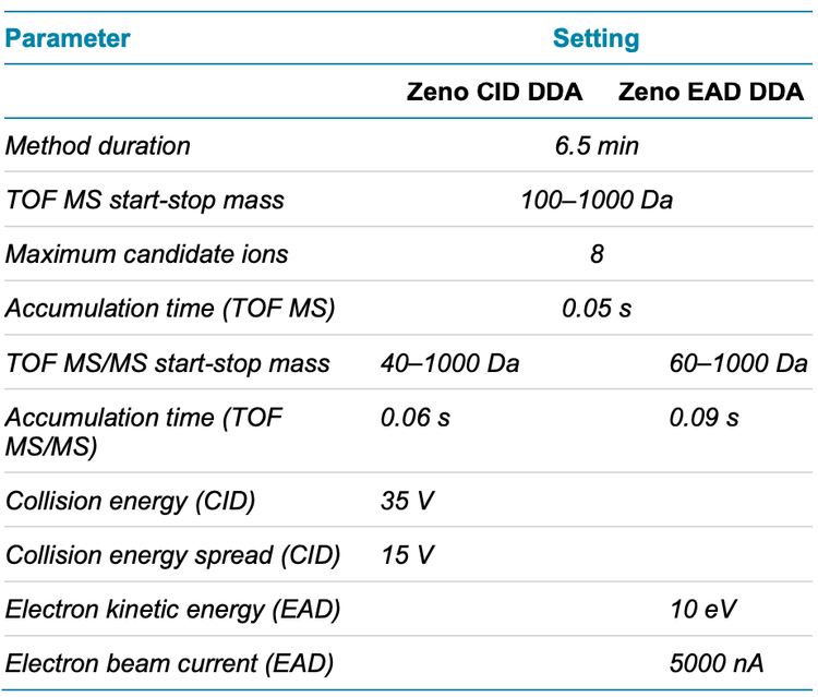 - Accurate and comprehensive CID and EAD MS/MS data were generated on the ZenoTOF 7600 system using a fast LC gradient workflow