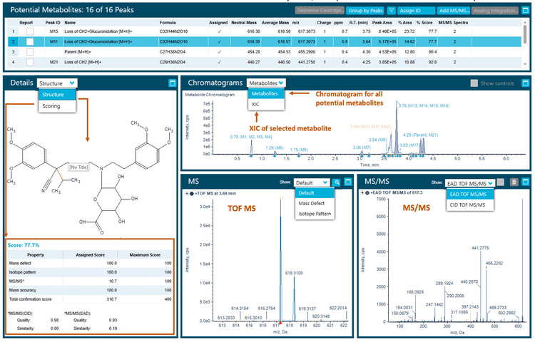 Interpretation of the site of metabolism was enabled by the automated assignment of the structures, based on the relative weighting of Zeno EAD and Zeno CID spectra on a scale of 1% to 100%. The interpretation panel in the software allows users to modify structures and the total score for the modified structures. Figure 2 shows the overview of the results panel, in which users can view the list of potential metabolites, assigned structures and scoring information. A potential metabolite is scored based on the mass defect, isotope pattern, MS/MS data and mass accuracy. The data can be viewed using TOF MS or MS/MS spectra and XICs. The software also displays the mass defects and isotope patterns of the metabolites.