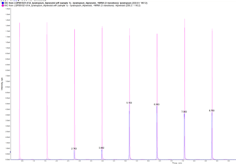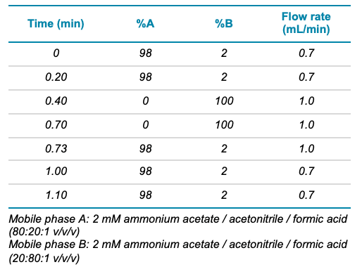 LC-MS/MS analysis: A 4 µL sample of the supernatant was injected onto a C18 column (20 x 2 mm, 3 µm) and was eluted using a fast linear gradient (Table 1). The run time for the 8 sample injections per compound was 10 minutes (Figure 2).