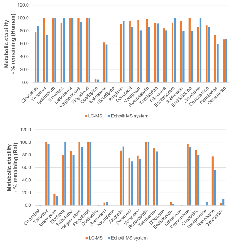 Sample preparation: The metabolic stability assay evaluates cytochrome P450 (CYP)-mediated metabolism of 23 commercially available compounds in human and rat microsomes. Solutions containing the test compounds at 3.5 mM in DMSO were diluted with acetonitrile to 50 µM. A 1 mg/mL microsomal suspension was prepared in 100 mM sodium phosphate pH 7.4 and 6.6 mM magnesium chloride. The suspension was pre-heated to 37°C and the diluted test samples were then added. The reaction was initiated by adding 17 µL of pre-heated 5 mM NADPH in 100 mM sodium phosphate at pH 7.4 into 153 µL of reaction mixture. The reaction mixture was mixed well and 75 µL was transferred into 150 µL of quench solution (100 µM 2,7 dimethyloxynaphthalene in acetonitrile) at the 0-minute time point (T0) and again after 10 minutes of incubation (T10). The quenched reaction mixtures were centrifuged for 15 minutes at 1500 RPM and 60 µL of the supernatant was transferred to a 384 well plate for LC-MS/MS. For the Echo® MS system analysis, 60 µL of the supernatant was transferred to a 384 well plate, evaporated to dryness and reconstituted in 60 µL of 95:5 water:methanol with 500 nM alprenolol as the internal standard. The plate was placed on the shaker for 5 minutes, then centrifuged for 2 minutes at 3500 RPM. 40 µL of the reconstituted samples was transferred to an Echo® MS Qualified 384 well plate, centrifuged for 5 minutes at 1500 RPM, then shaken for 5 minutes.