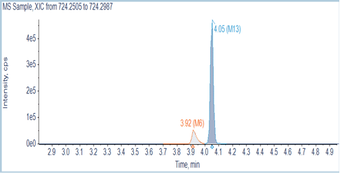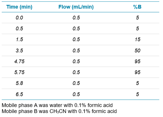 Chromatography: An ExionLC AD HPLC system was used for separation on a Phenomenex Luna Omega Polar C18, 3mm, 150 x 2.1 mm (P/N 00F-4760-AN) column using 5 µL injection volume. Table 1 below shows LC gradient parameters.