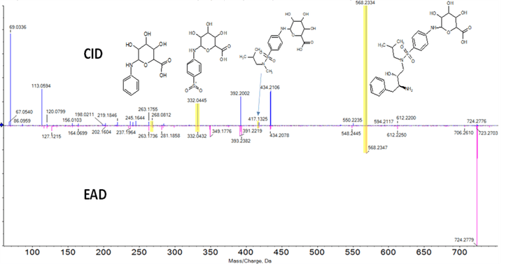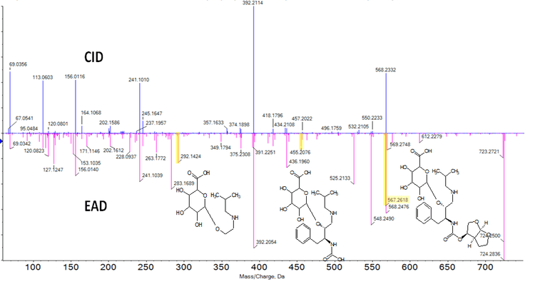 Several metabolites were observed for darunavir using both CID and EAD fragmentation, and those shown in Figure 2 were able to be interpreted consistently using both fragmentation approaches.