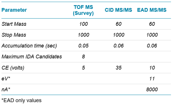 Mass spectrometry: The samples were analyzed twice, once using Zeno IDA with CID method and once with a Zeno EAD IDA method using the ZenoTOF 7600 System. Method parameters are shown in Table 2. Data was acquired using SCIEX OS software.