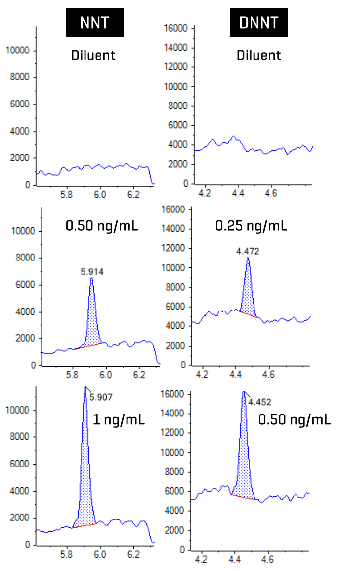 The assay accuracy was within ±4% and ±2% of the actual concentration, and the %CV was <10 and 7 for NNT and DNNT, respectively. The calculated percentage accuracy and %CV values were within the acceptance criteria at each concentration level (Figure 6).