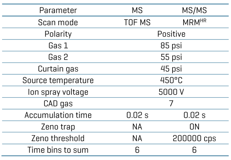 Mass spectrometry: Samples were analyzed using the Echo® MS+ system with ZenoTOF 8600 system operating in positive ion mode. The data were acquired using a Zeno MRMHR experiment. The optimized MS parameters are listed in Table 1. Transitions used for analysis are summarized in Table 2.