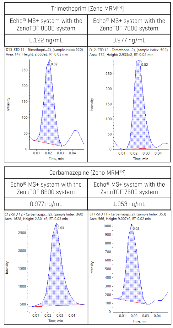 The quantitative performance of the Echo® MS+ system with ZenoTOF 8600 system was evaluated by analyzing 13 small molecules in an extracted microsomal stability matrix sample. Up to an 8-fold improvement in LLOQ was observed across 13 small molecules using the Echo® MS+ system with ZenoTOF 8600 system compared to the Echo® MS+ system with ZenoTOF 7600 system (Figure 1). Representative examples of small molecule s were displayed to highlight the improvement in LLOQ on the Echo® MS+ system with ZenoTOF 8600 sy stem versus the Echo® MS+ system with ZenoTOF 7600 system (Figure 2). Trimethoprim and carbamazepine showed 8- and 2- fold improvements in LLOQ respectively, representing the maximum and minimum improvements in the analyzed panel of small molecules.