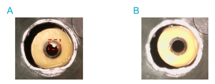 Why is robustness important in high-throughput screening (HTS)? Insufficient robustness in analytical methods can lead to inconsistent data quality and downtime. This, in turn, results in prolonged project timelines, additional costs and an increased need for manual intervention.1,2 Components, including salts such NaCl or MgCl2, or stabilizer proteins such as bovine serum albumin (BSA) and Prionex, are commonly used in sample matrices for HTS. Interactions with organic carrier solvents can cause these components precipitate out of solution and build up at the Open Port Interface (OPI). The gradual accumulation of matrix material can reduce instrument performance, leading to poor reproducibility and lowered sensitivity. To meet the robustness needs of HTS, the Echo® MS+ system has an OPI port wash. The washing cycle uses an aqueous solvent to facilitate the removal of these deposits and significantly enhance system robustness when analyzing large quantities of sample (Figure 1).