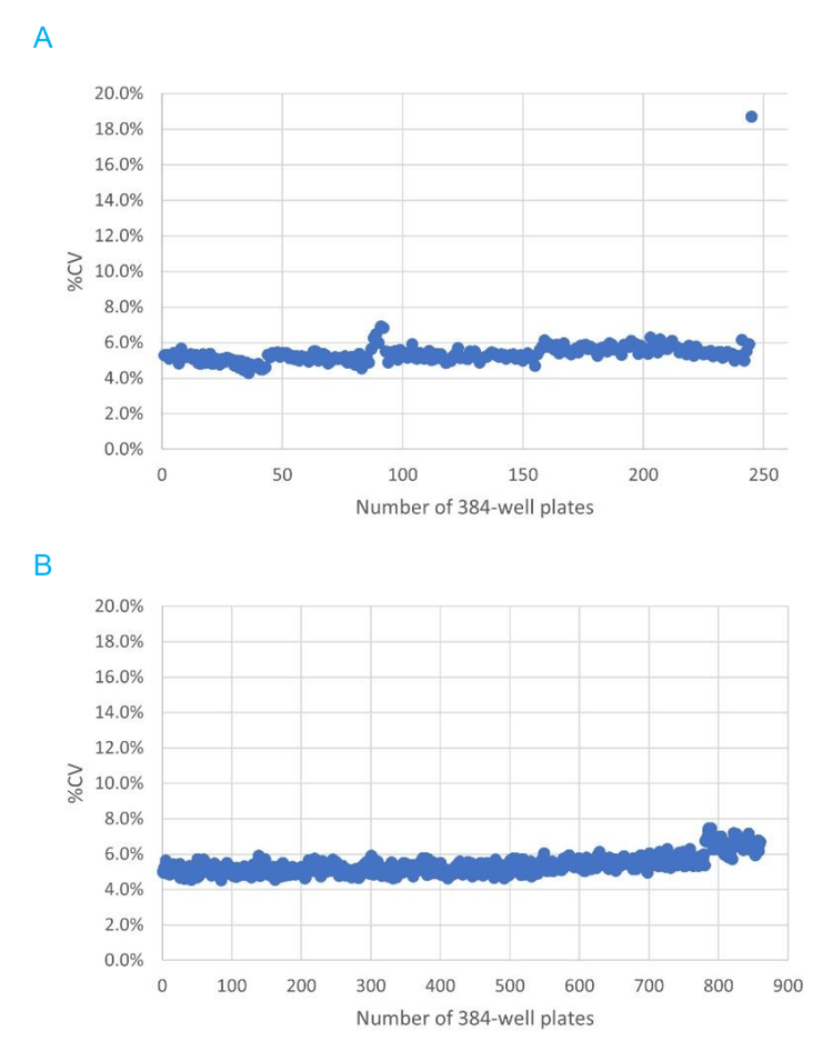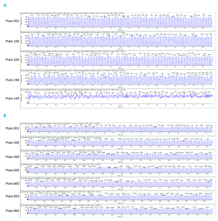 In contrast, when the OPI port wash cycle was scheduled once every 384 ejections, the %CV of DXM was maintained at <6% until plate 800 (Figure 5B). After that, the %CV of most plates continued to be <7%. This slight increase in %CV at plate 781 was attributed to the gradual decrease in peak area counts. The peaks continued to be distinctive until plate 860 (Figure 4B).