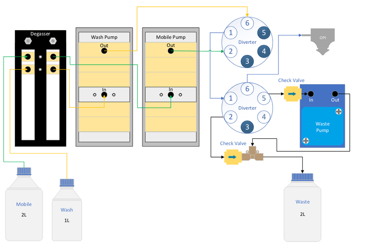 In the Echo® MS+ system, the carrier solvent is drawn from the solvent bottle to the degasser using a gear pump to eliminate potential dissolved gases. The degasser outlet is directly connected to a pump equipped with a flowmeter for precise and accurate solvent delivery. The pump outlet is linked to a diverter valve, controlling the flow to the OPI for Acoustic Ejection Mass Spectrometry (AEMS) operations or to a waste container for pump purging. To conduct the OPI port wash, a second independently controlled pump system was introduced to deliver the wash solvent (Figure 2). This secondary system includes an additional solvent bottle, degasser and pump. Calibration of flow rates for water, methanol and acetonitrile combinations is performed to ensure precise control over a broad range of wash solvents. Two 6-port rotary valves are employed to achieve different flow conditions.