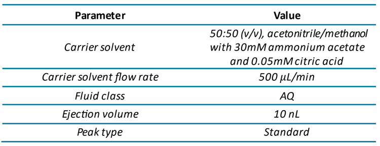 The carrier solvent was 50:50 (v/v), acetonitrile/methanol with 30mM ammonium acetate and 0.05mM citric acid (Table 1). In the study using the OPI port wash, 50:50 (v/v), methanol/water was used as the wash solvent. The wash solvent was introduced into the OPI for a scheduled 3-minute cleaning cycle after every 384 ejections.