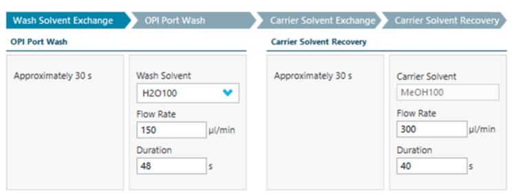 The OPI port wash performs a cycle consisting of 4 phases (Figure 3). The 2 phases of solvent exchange, including a wash solvent exchange and a carrier solvent exchange, ensure that the content of the OPI is emptied before the next solvent is introduced. Once the OPI is emptied, the cleaning and carrier solvent recovery phases are performed. The settings for the cleaning and recovery phases are adjustable.