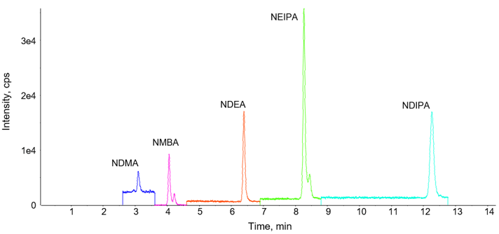 All of the analysis described here has been performed on the SCIEX QTRAP 4500 LC-MS/MS System, coupled to an ExionLC AD System. This system was used because it is able to achieve the current limits within sartan APIs and can be utilized for routine analysis even at challenging limits of detection and quantification.