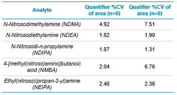 Initially, five nitrosamine compounds were analyzed, in line with the European pharmacopeia (chapter 2.5.42) (see Table 2 below for a list of compounds analyzed), at a concentration of 0.45 ng/mL. This provided a limit of 0.015 µg/g after taking sample preparation into account. Each API was individually spiked at this level and analyzed across 6 replicates (Figure 2). The observed reproducibility, the %CV values, are provided for each compound in Table 2. All nitrosamines analyzed on this method provided acceptable reproducibility within the 5 APIs, measured with %CV values <15% and S/N values >10x. The limit of 0.015 µg/g was initially chosen to highlight that the SCIEX QTRAP 4500 LC-MS/MS System is capable of easily achieving the limit of 0.03 µg/g in all APIs analyzed. All subsequent analysis was at the specification limit of 0.03 µg/g (0.9 ng/mL) to more closely resemble the levels which would typically be expected when following the European pharmacopeia method.