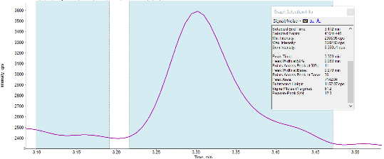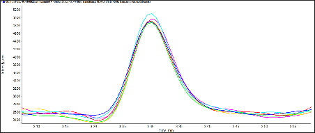 In nitrosamine analysis, the limit of quantification is important to meet the limits set by regulatory agencies, such as the Federal Drug Administration (FDA) and the European Medicines Agency (EMA). According to these agencies, nitrosamine impurities in drug products must not exceed 0.03 µg/g when the maximum daily dosage is <880 mg/day.2 This limit was considered to assess the presented method to ensure this level was met or exceeded. Figure 1 shows extracted ion chromatograms (XICs) from 6 consecutive injections of NDMA spiked into sample near the regulatory limit. An XIC of the quantifier transition for NDMA at the LLOQ of 0.5 ng/mL is shown in Figure 2. With this preparation, a concentration of 0.5 ng/mL equates to a concentration of 0.013 µg/g, demonstrating that NDMA can be quantified in sample at levels lower than the 0.03 µg/g limit.