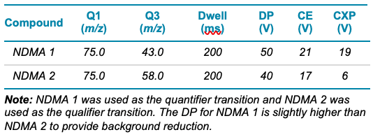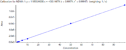 - NDMA was quantified across a linear range that spanned 0.5 to 100 ng/mL, with an r value >0.99
