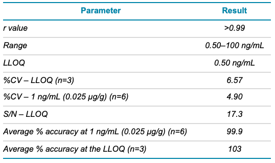 In addition to sensitivity, several other criteria were assessed, including linearity, precision and accuracy. The linearity of the calibration curve spanned 0.5–100 ng/mL with an r value >0.99. At all concentrations measured, accuracy values were between 90% and 110%. Precision and accuracy were assessed at both the LLOQ (0.5 ng/mL) and just below the specification level, at 1 ng/mL (0.025 µg/g in sample, based on a limit of 0.030 µg/g). At both concentration levels, the %CV was <10% and accuracy values were between 95% and 105%. Table 3 summarizes the standard criteria assessed and Figure 3 shows the calibration curve that spans 0.5 to 100 ng/mL.