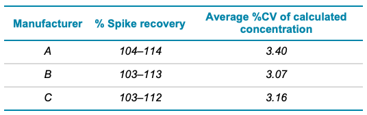 - Excellent accuracy and reproducibility were attained for spike-recovery studies using various drug product matrices, demonstrating feasibility of the assay for quantification