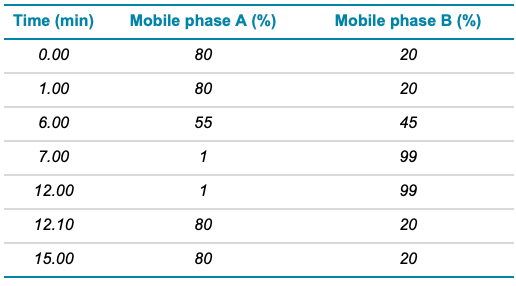 Chromatography: An ExionLC system was used with a Phenomenex Kinetex biphenyl analytical column (2.6 µm, 150 x 4.6 mm). Mobile phase A was 0.1% formic acid in water and mobile phase B was 0.1% formic acid in methanol. The flow rate was 0.8 mL/min and the injection volume was 30 µL. The column temperature was set to 40°C. The gradient used is summarized in Table 1.