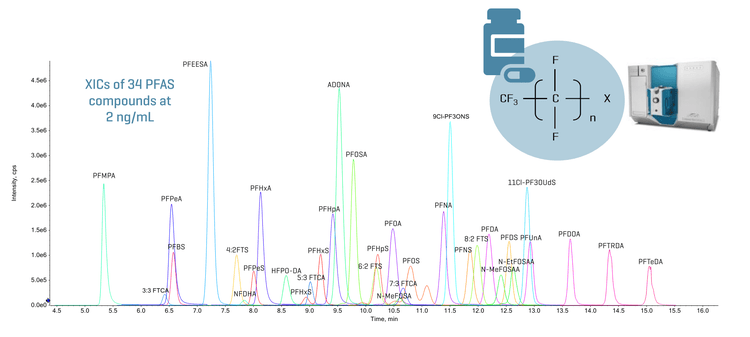 Sub-ng/mL levels of LOQs were achieved for 34 PFAS compounds analyzed on the SCIEX 7500+ system.