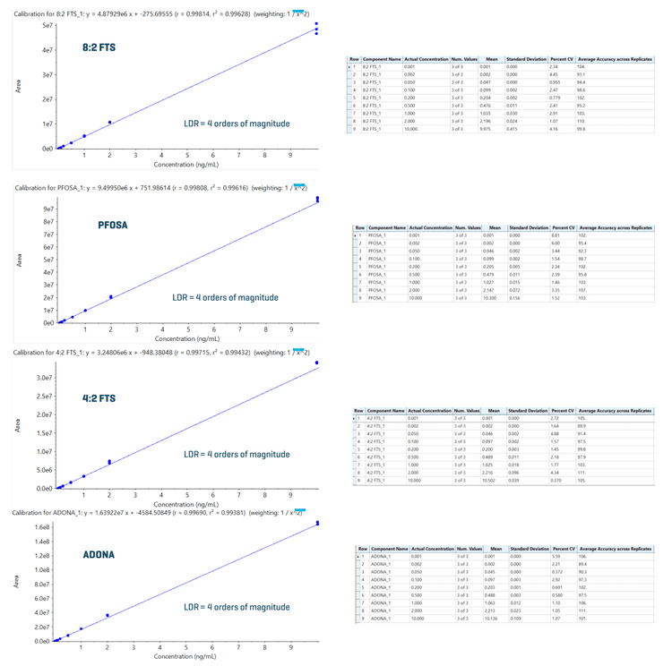 Excellent quantitative performance was achieved with an r2 of ≥0.99 for all PFAS and LDR spanning ≥3.2 orders of magnitude achieved on the SCIEX 7500+ system.