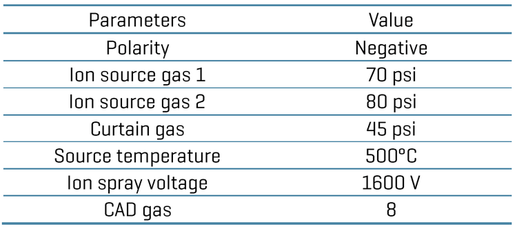 Chromatography: Chromatographic separation was achieved on an ExionLC AD system (SCIEX). A delay column (Phenomenex Luna Omega PS C18 column; 3 x 50 mm, 5 μm, 100 Å) was used after the LC mixer for chromatographic delay of any possible PFAS contamination coming from mobile phase solvents. A Phenomenex Luna omega PS C18 column (2.1 x 100 mm, 3 μm, 100 Å) was used to achieve baseline analytical separation of the PFAS compounds. The column temperature was set at 50°C. A flow rate of 0.6 mL/min was used. Mobile phase A was 2 mM ammonium acetate in water and mobile phase B was 0.05% acetic acid in methanol. An injection volume of 3 μL was used for the analysis.