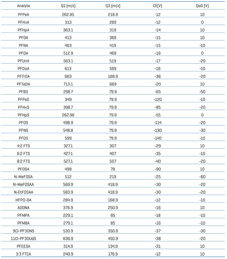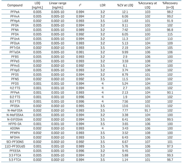 Sensitive quantitation of PFAS compounds: Limit of quantitation (LOQ) ranging between 0.001 and 0.005 ng/mL was achieved with an accurate and highly reproducible (%CV <14) quantitative performance across 34 PFAS using a low injection volume (3 µL)