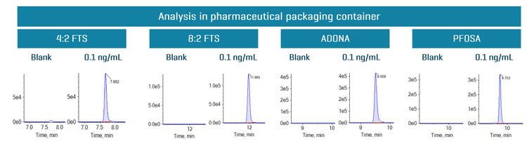 Figure 4 shows representative XICs of the blank samples from the pharmaceutical packaging container and at 0.1 ng/mL of spiked in 8:2 FTS, 4:2 FTS, PFOSA and ADONA. No PFAS compounds were detected in the pharmaceutical packaging container as represented in the blank XICs.