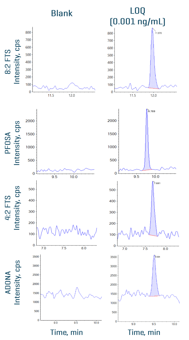 An LOQ of ≤0.005 ng/mL was achieved for all 34 PFAS compounds. Figure 2 shows the XICs at the LOQ levels for 8:2 FTS, 4:2 FTS, PFOSA and ADONA. No background interference was observed in the blank samples. Figure 3 shows quantitative performance for 8:2 FTS, 4:2 FTS, PFOSA and ADONA. For the 4 representative PFAS compounds, the LDR was ≥3.3 orders of magnitude with an r2 of ≥0.993 and an assay accuracy of ±12% (of the nominal concentration) with %CV <6.